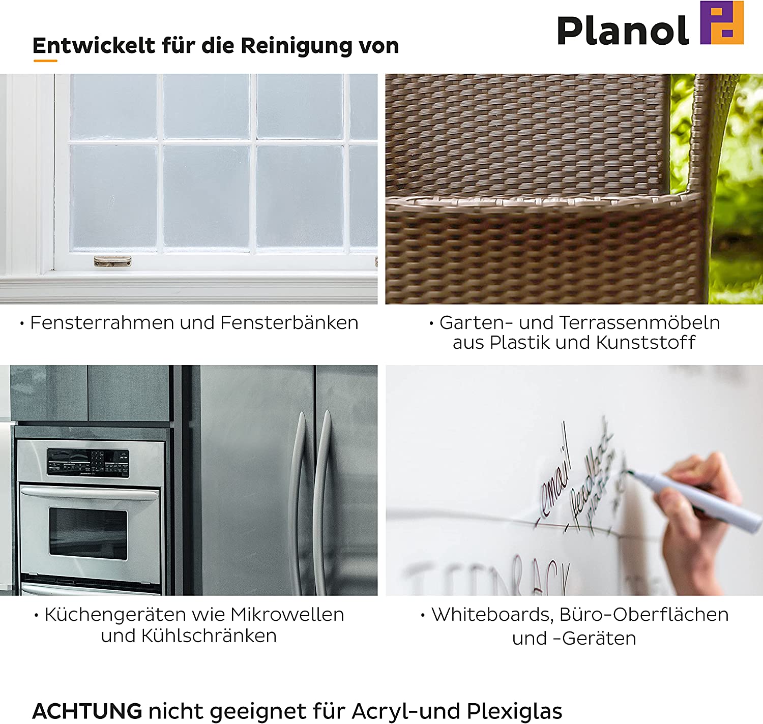 Das Produkt entfernt zuverlässig Flecken, Fingerabdrücke, Kugelschreiberstriche, Stempelfarbe und Nikotinrückstände. Dank seiner Vielseitigkeit ist Plano FORTE ein universelles Reinigungsmittel für Kunststoff-, Edelstahl- und Aluminiumflächen.